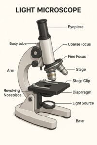 Transmission Electron Microscope (TEM): shows internal structures of cells (organelles, membranes).